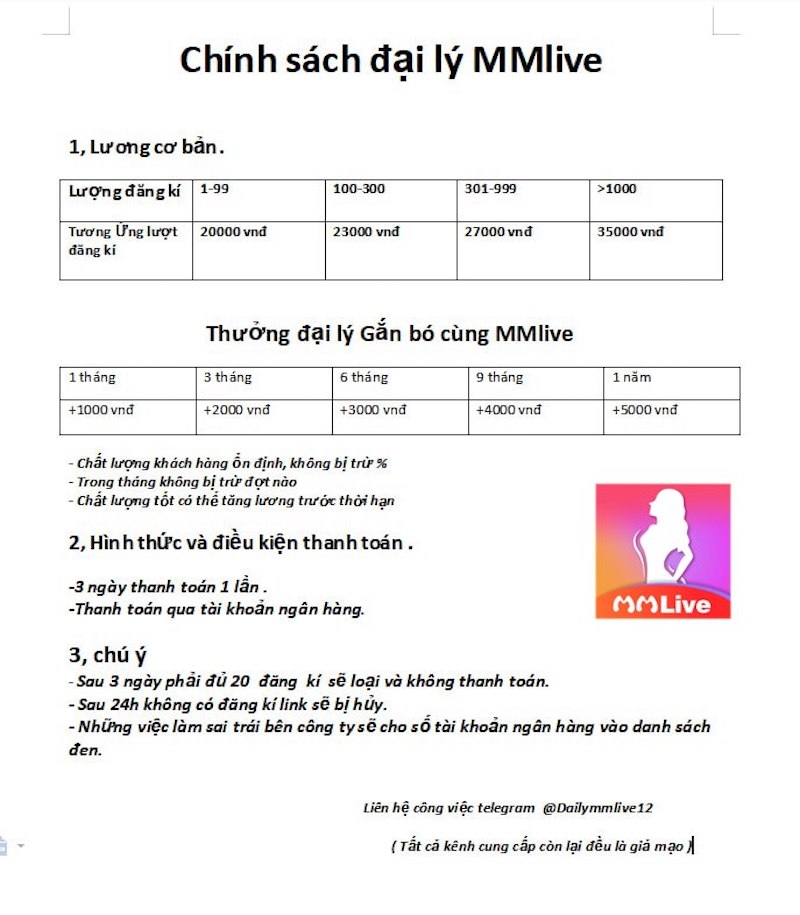 - Cuối cùng, những đại lý MMlive đã cam kết và làm việc trong 1 năm sẽ được thưởng cộng thêm +5,000 VNĐ cho mỗi lượt đăng ký.